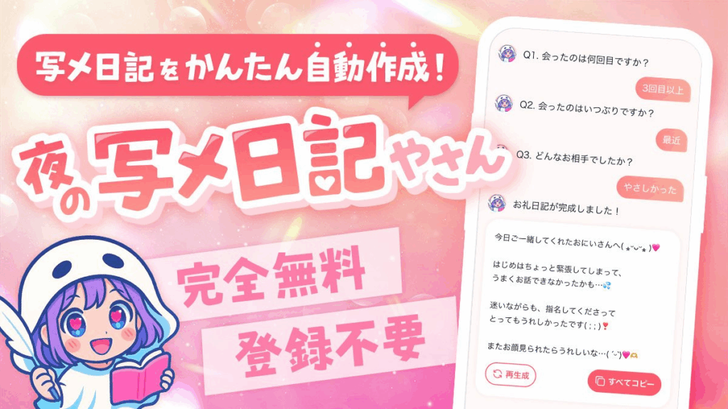 どんな構成で書くか迷ってしまったときは、自動写メ日記作成ツール【夜の写メ日記やさん🌙】を使うのもいいですよ。